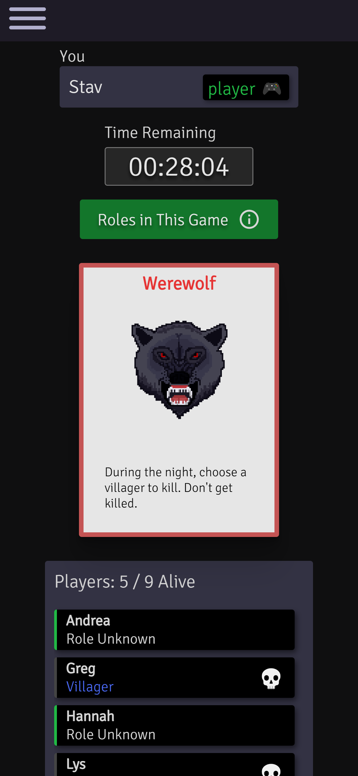 Inspired by my time playing Ultimate Werewolf and by 2020's quarantine. The app is free to use, anonymous, and fully open-source under the MIT license. After a long hiatus I've rewritten a lot of the code. This was (and still is) fundamentally a learning project, so feedback or assistance is appreciated.