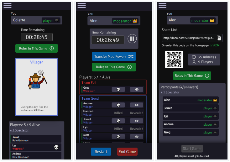 A free, anonymous application to run games of Werewolf (Mafia) smoothly when you don't have a deck, or when you and your friends are together virtually. Basically, a host builds a game and deals a role to everyone's device, and then the app keeps track of the game state (timer, who is killed/revealed, etc). Since people tend to have their own preferences when it comes to what roles they use or how they run the game, the app tries to take a generalized, flexible, hands-off approach - it won't run day and night for you and won't implement any role abilities. Hosts can use any roles they want, in any configuration, and can create their own roles if the provided ones don't meet their needs.